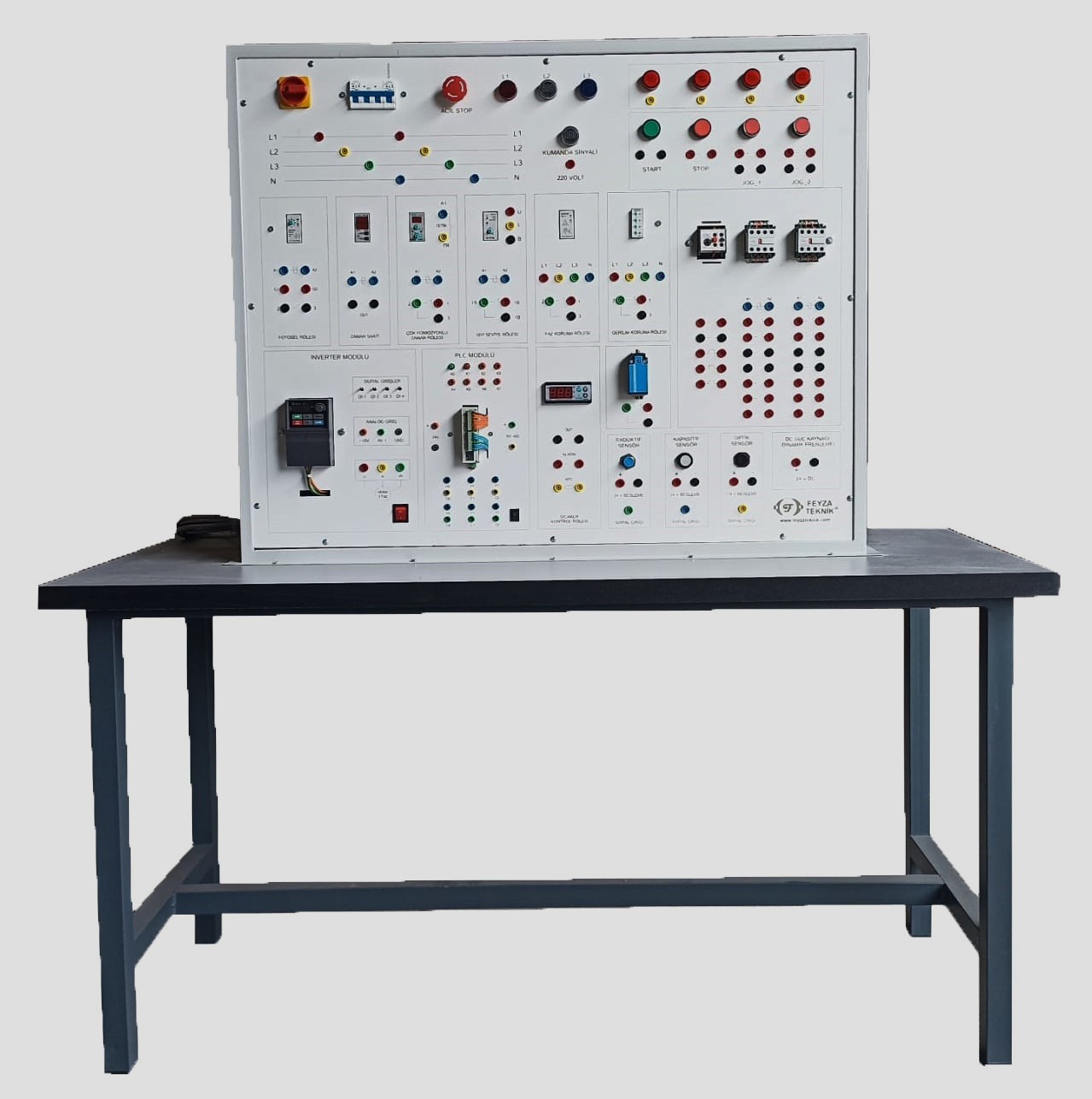 Eğitim setinde güvenlik için; Kaçak akım koruma rölesi, 3 fazlı ve 1 fazlı Otomatik sigorta ve acil stop butonu bulunmaktadır.