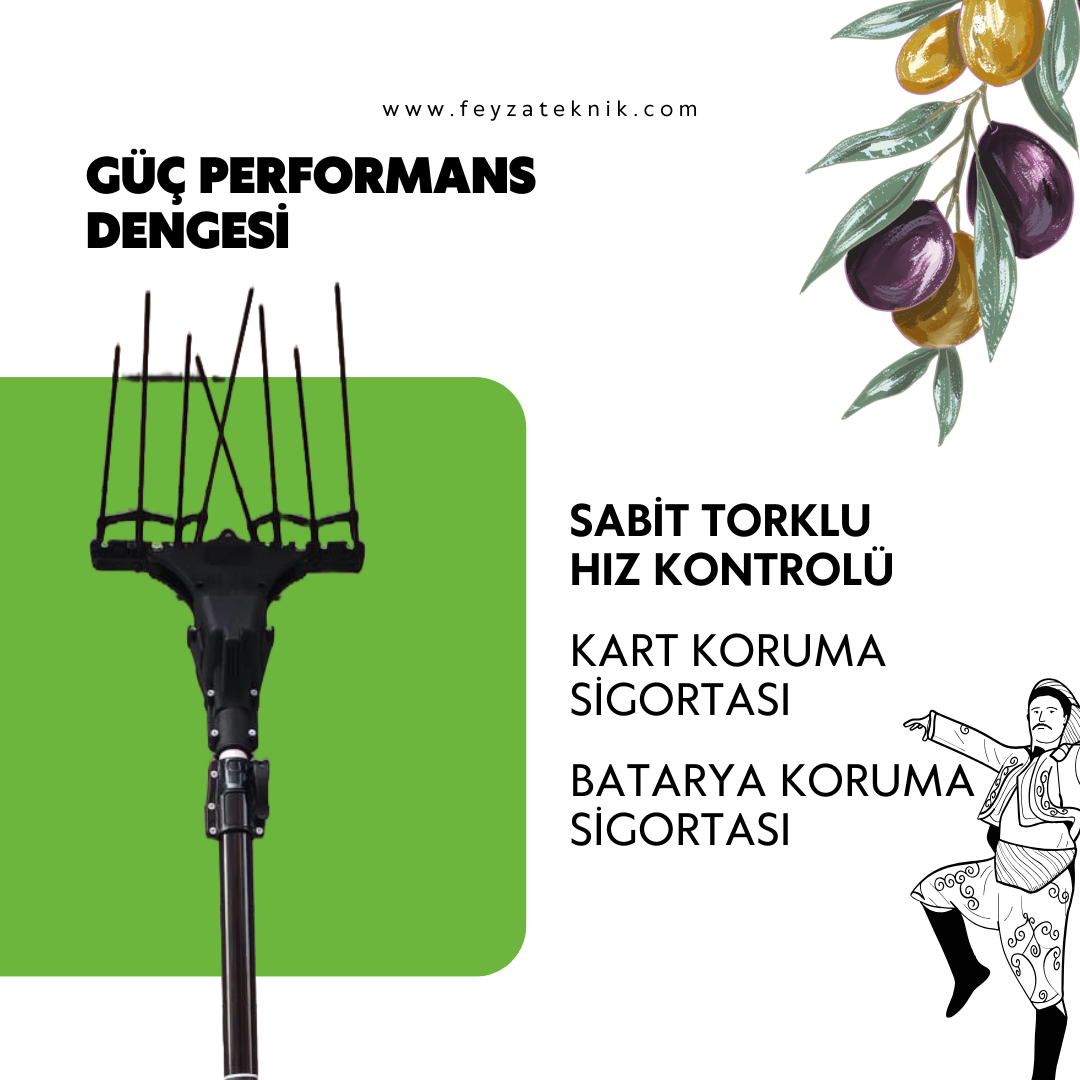 Kullanma kurallarını dikkate alarak LiFePO₄ bataryanın yüksek enerji yoğunluğu sayesinde tek şarjla uzun süre çalışma imkânı. Büyük arazilerde bile kesintisiz hasat. 2 ton zeytin toplama ölçüsü hesaplar sonucunda elde edilen tahmini performans ölçüsüdür. -
